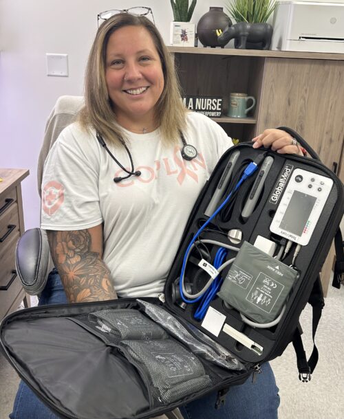 Jennifer Huffman, NP, is pictured with one of the telehealth backpacks.